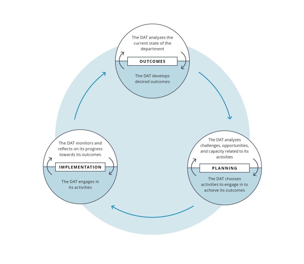 At a high level, the DAT analyzes the department’s current state relative to the selected focus and defines desired outcomes. Based on initial and subsequent analyses, the DAT selects activities to help achieve the outcomes. As the DAT engages in those activities, it monitors and reflects on the progress made toward those outcomes.